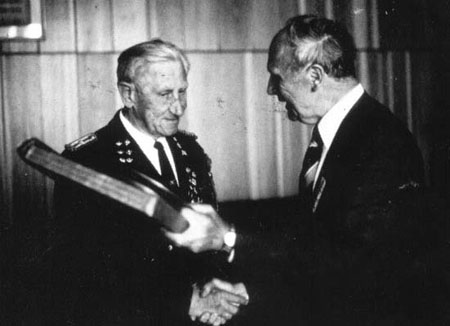 Gerhard Pieske überreicht den "Netzekreis - Ehrenteller" an Chr. Ehm Christensen, Tondern, für den Nordfriesischen Schützenbund