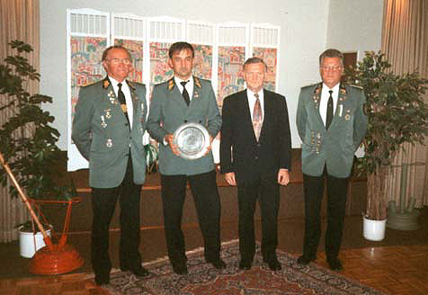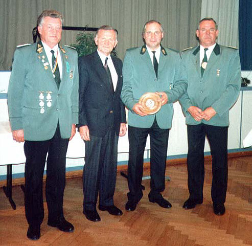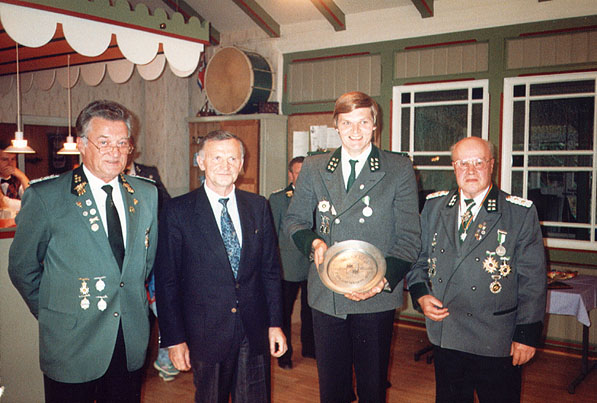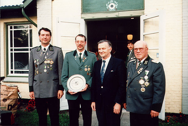 v.l. II. Ältermann Manfred Petersen, Andreas Zeibig / Niebüll Gewinner des "Netzekreis-Ehrentellers" , Karl-Heinz Mattheus und Ludwig E. Bögh, I. Ältermann des Schützenkorps Tondern,